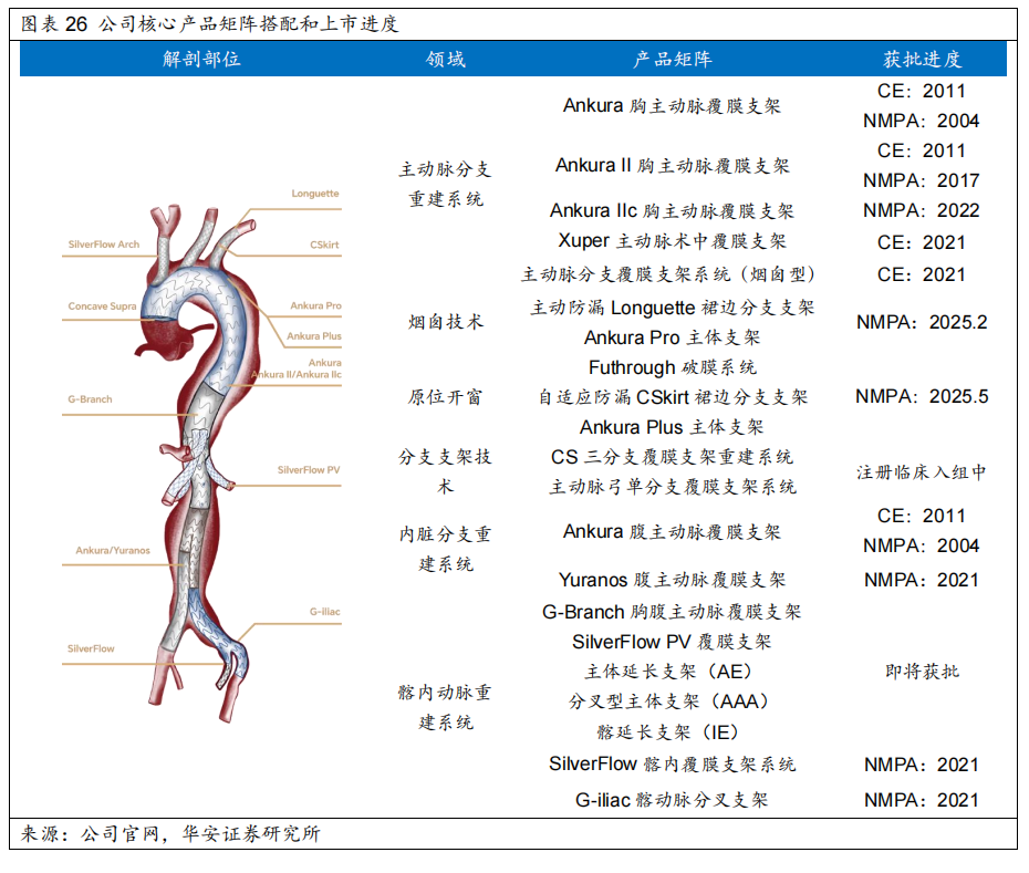 形成以主动脉大支架全产品矩阵,多款创新产品“精准化+个性化”纵深发展。公司长年深耕覆膜支架领域,形成了主动脉弓部分支+胸主+胸腹主+腹主+髂主动脉分支+内脏分支+髂内动脉为核心垂类的全域产品包矩阵。同时公司多款特色创新产品屡次打破国产治疗空白:1)Longuette裙边支架(烟囱型):由Ankura™ Pro主动脉主体覆膜支架系统和Longuette™主动脉分支覆膜支架系统组成。2)原位开窗支架:Futhrough破膜系统、自适应防漏CSkirt裙边分支支架、Ankura Plus主体支架组成。3)CS主动脉弓部分支重建系统:由中国医学科学院阜外医院舒畅教授团队细化后形成的产品,能够避免传统开胸手术的巨大创伤、深低温停循环的手术打击。4)G-Branch胸腹主动脉覆膜支架:G-Branch胸腹主动脉覆膜支架系统可在完全微创腔内技术下进行分支血管重建,为国际公认难题提供了解决方案,其突破性地实现了单支架重建腹腔干、肠系膜上动脉及双肾动脉,将原本需要开腹、体外循环的巨创手术转化为微创介入治疗。5)髂内动脉重建系统:包括G-Branch胸腹主动脉覆膜支架、SilverFlow PV覆膜支架、主体延长支架(AE)、分叉型主体支架(AAA)、髂延长支架(IE)。