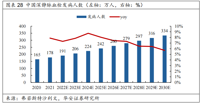 我国深静脉血栓发病率约为0.13%。我国深静脉血栓发病人数预计2024年增长到224万人,从2020年到2024年的复合年增长率为7.94%。预计到2030年,我国深静脉血栓发病人数将达334万人,2020年到2030年的年复合增长率为7.31%。