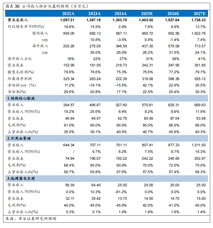 2024年,国家医保局要求12家国内外企业(含公司)重新制定胸主动脉覆膜支架产品的价格,旨在压缩流通环节的过高加价,实现价格透明化;此外,多省市针对封堵器和腔静脉滤器进行集采。集采导致的价格调整致公司相关产品出厂价下滑,是造成公司24H2收入及利润同比下滑的主要原因。我们预计为期一年的价格调整有望在25H2逐步出清,困境反转。在国际化业务方面,公司秉承“创新”+“国际化”的发展战略,公司主要在售产品的市场份额长期处于国内领先地位;截至2024年年底,公司拥有7个境外子公司,海外取得注册证达1059个,销售网络覆盖全球117个国家和地区,是国内少有的业务具高度国际化的三类介入医疗器械企业。产品迭代方面,我们预计公司多款二代主动脉支架产品有望在25-26年获批海外注册证;重磅FIC产品方面,IBS冠脉铁基支架的海外获批带来国际化收入的快速放量;BD合作方面,剑虎医疗战略合作下公司享有电生理海外独家经销权亦会带来收入增量。