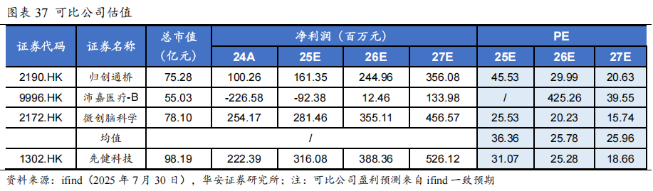 选取H股医药生物板块下的血管介入高值耗材公司进行对比:归创通桥,沛嘉医疗,微创脑科学。截至2025年7月30日,H股可比公司2025-2027年市盈率(PE)均值为36/26/26倍(沛嘉医疗25-26E预测PE异常,均值仅计算归创通桥、微创脑科学),我们预测公司2025-2027年市盈率(PE)为31/25/19倍。