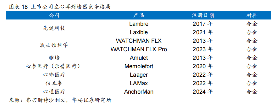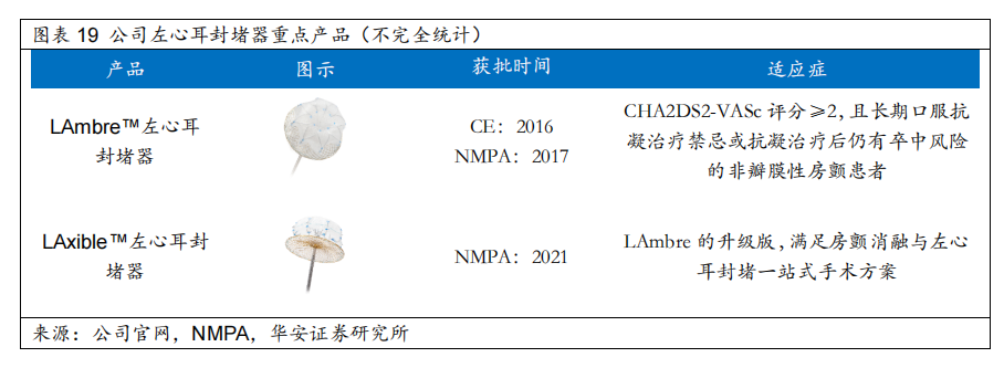 公司左心耳封堵器产品上市较早,抢占先机。左心耳封堵器疗法仍处于新兴阶段,根据2022年《中国医疗器械蓝皮书》数据显示,波士顿科学占据我国左心耳封堵器市场67%的份额,国产品牌先健科技占据25%的市场份额。截至2024年年底,国产左心耳封堵器产品市场仅有七名主要参与者。公司最早分别于2017年和2021年上市了Lambre和Laxible左心耳封堵器,在中国市场抢占先机。