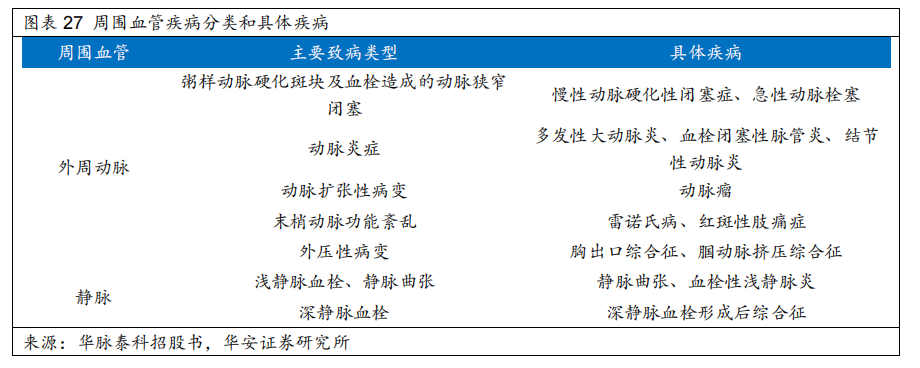 周围血管疾病(Peripheral vascular disease,PVD)是一种慢性肢体缺血性疾病,临床上将心脑血管病以外的血管疾病统称为周围血管病。周围血管主要包括外周动脉和静脉。周围血管疾病的致病原因主要是动脉粥样硬化,逐渐形成斑块而引起血栓,继而钙化发展导致血管闭塞,少数情况下,动脉硬化可导致动脉壁受损变得薄弱,形成动脉瘤。主要临床表现包括肢体肿胀、肢体疼痛及间歇性跛行。