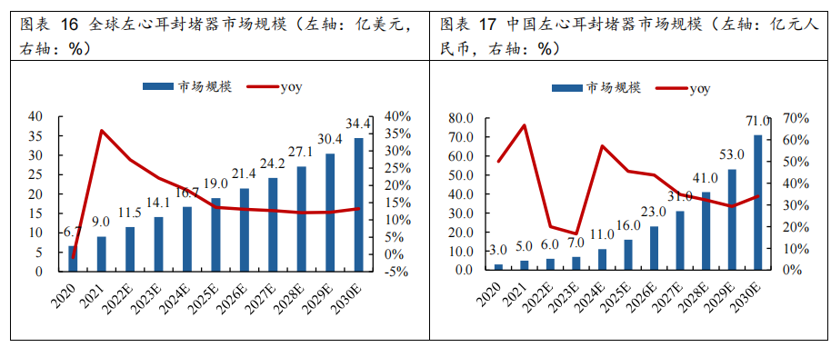根据弗若斯特沙利文2022年预测,全球左心耳封堵器市场由2020年的6.7亿美元增至2030年的预计34.4亿美元,年复合增长率为17.9%;中国左心耳封堵器市场由2020年的人民币3.0亿元增至2030年的预计71.0亿元,年复合增长率为37.2%。