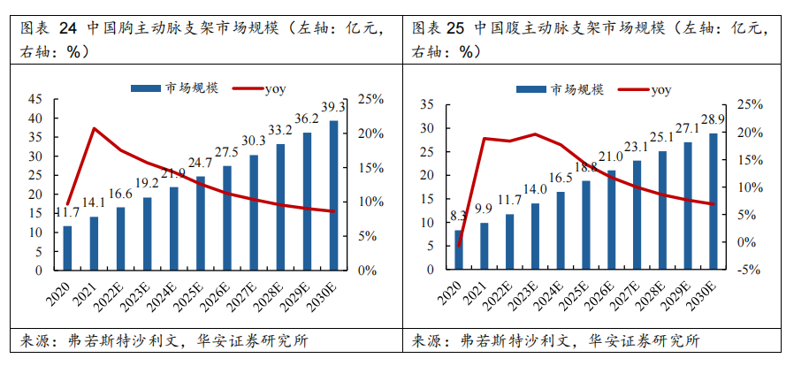 胸/腹主动脉支架市场规模稳步增长。根据弗若斯特沙利文2022年预测,我国胸主动脉支架市场规模由2020年的11.7亿元增至2030年的预计39.3亿元,年复合增长率为12.9%;我国腹主动脉支架市场规模由2020年的8.3亿元增至2030年的预计28.9亿元,年复合增长率为13.3%。