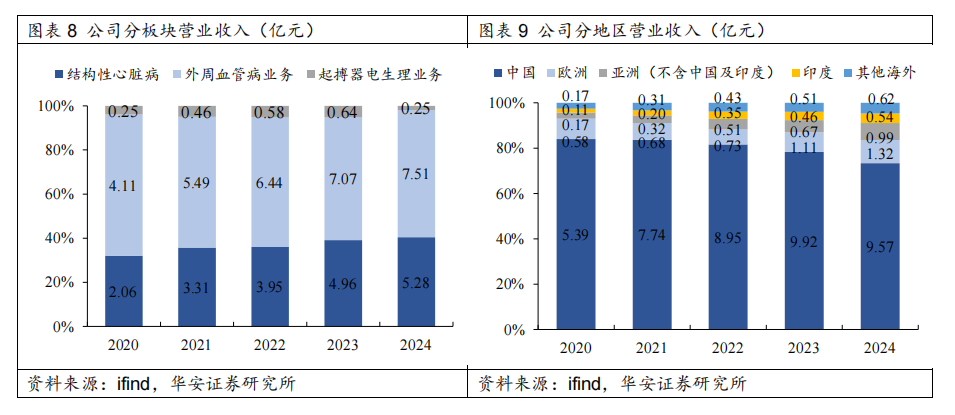 公司专注结构心和外周血管病领域。根据2024年公司年报,外周血管病业务营业收入实现7.51亿元,较2023年同期增长约6.2%;结构性心脏病业务实现收入5.28亿元,较2023年同期增长约6.5%。2020-2024年,公司外周血管病业务和结构性心脏病业务实现持续增长态势。起搏器电生理业务为公司非核心业务收入,收入占比低于5%。2024年,公司海外收入占比约26.6%,海外收入占比逐年提升。海外收入占比较高的国家或地区依次是欧洲、亚洲(不含中国和印度)和印度地区。