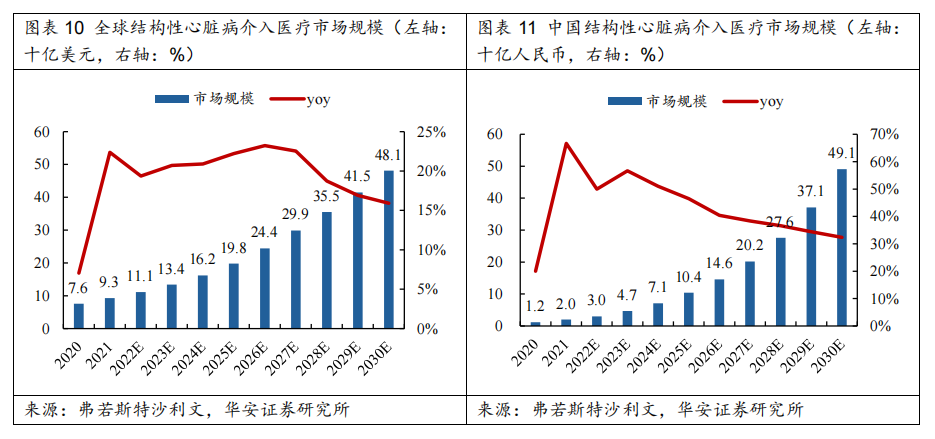 预计2030年中国结构性心脏病市场规模491亿元。针对结构性心脏病的介入治疗是一种通过血管穿刺途径进入心腔或血管以进行结构性心脏病诊断或治疗的技术。符合针对结构性心脏病的介入治疗条件的患者主要包括不能进行外科手术、经药物治疗后无改善或外科手术后无明显改善者。根据弗若斯特沙利文2022年预测,全球结构性心脏病介入医疗器械市场由2020年的76亿美元增至2030年的预计481亿美元,年复合增长率为20.3%;中国结构性心脏病介入医疗器械市场由2020年的人民币12亿元增至2030年的预计491亿元,年复合增长率为44.9%。