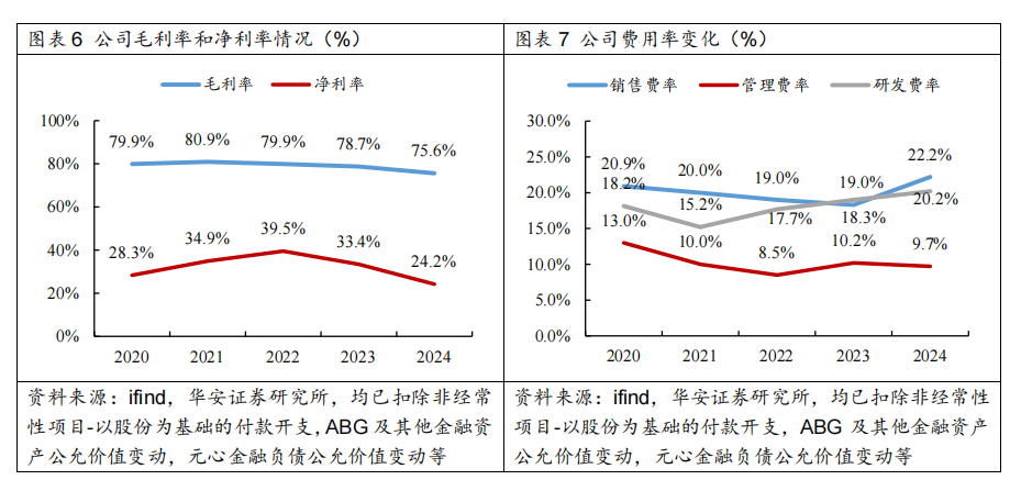 毛利率稳定在75%以上,净利率短期有所调整。盈利能力方面,2024公司的扣非毛利率和扣非归母净利率分别为75.6%和24.2%,二者与2023年相比均有所下滑,这主要是由于集采导致销售结构变动,低毛利产品占比增多,以及大支架价格调整。根据公司2024年数据,扣非端销售费率/管理费率/研发费率为22.2%/9.7%/20.2%,相较2023年在销售费用率、研发费用率上有所提升;公司在2024年研发投入为2.63亿元,较2023年同比增长9%,该变动主要是公司持续加强研发投入,加速推进新产品的研发及商业化进程的结果。