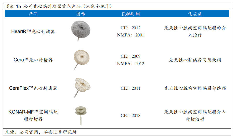 公司在先天性心脏病封堵器领域占据较大优势,从不同细分适应症来看,主要包括房间隔缺损封堵器、室间隔缺损封堵器和动脉导管未闭封堵器。截至2024年年报,公司总计上市及在研十余款先心封堵器产品,其中核心产品包括HeartR™先心病封堵器、Cera™先心病封堵器、CeraFlex™先心病封堵器以及KONAR-MF™室间隔缺损封堵器均在欧洲早年拿下CE注册证。