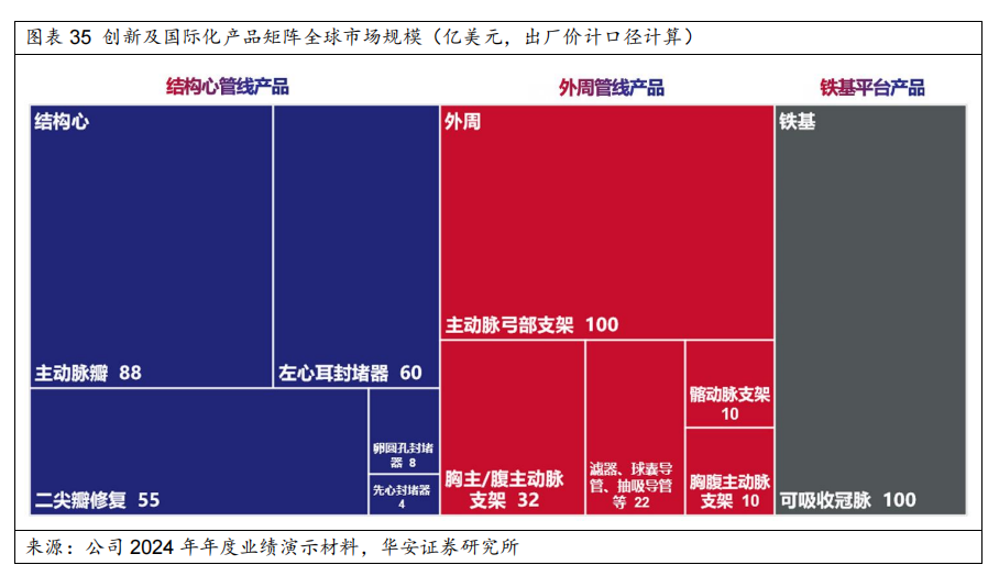 全球市场空间广阔,中国创新医疗器械出海大有可为。公司三大产品矩阵包括结构心管线产品、外周管线产品和铁基平台产品,全球市场空间预计490亿美元。根据2024年公司内部测算和第三方研究报告显示,结构心产品管线预计全球市场规模总计215亿美元(主动脉瓣88亿美元,左心耳封堵器60亿美元,二尖瓣修复55亿美元,卵圆孔封堵器8亿美元,先心封堵器4亿美元),外周管线产品预计全球市场规模总计174亿美元(主动脉弓部支架100亿美元,胸主/腹主动脉支架32亿美元,滤器、球囊导管、抽吸导管22亿美元,胸腹主动脉支架10亿美元),铁基可吸收冠脉支架100亿美元。