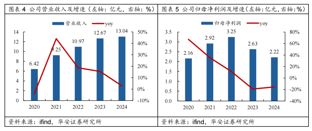 公司经营稳健增长,近期利润受到政策影响有所下滑。公司营业收入由2020年的6.42亿元增长至2024年的13.04亿元,期间年均复合增速为19.4%;2024营业收入13.04亿元,较2023年同比增长3%,增长放缓主要系部分产品价格调整后收入下降所致。公司净利润调整的主要原因主要系研发、销售费用较往期增加所致。