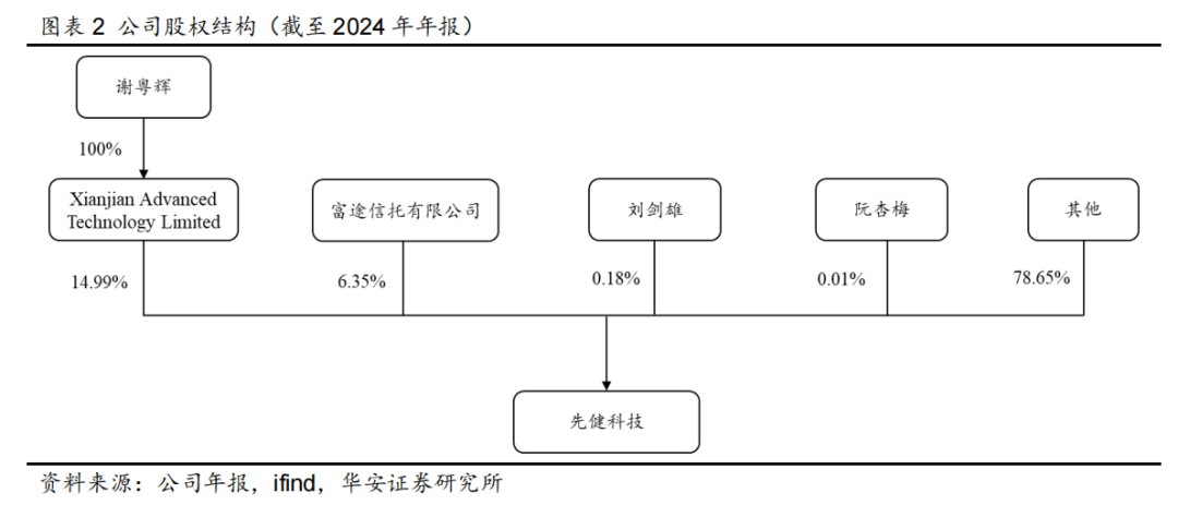 公司治理架构合理,股权结构分散。截至2024年年报,公司实际控制人谢粤辉持有14.99%的股份,其中所有股份均通过Xianjian Advanced Technology Limited间接持有。执行董事刘剑雄持有公司0.18%的股份,执行董事阮杏梅持有公司0.01%的股份。其他股东持有总计78.65%的股份。